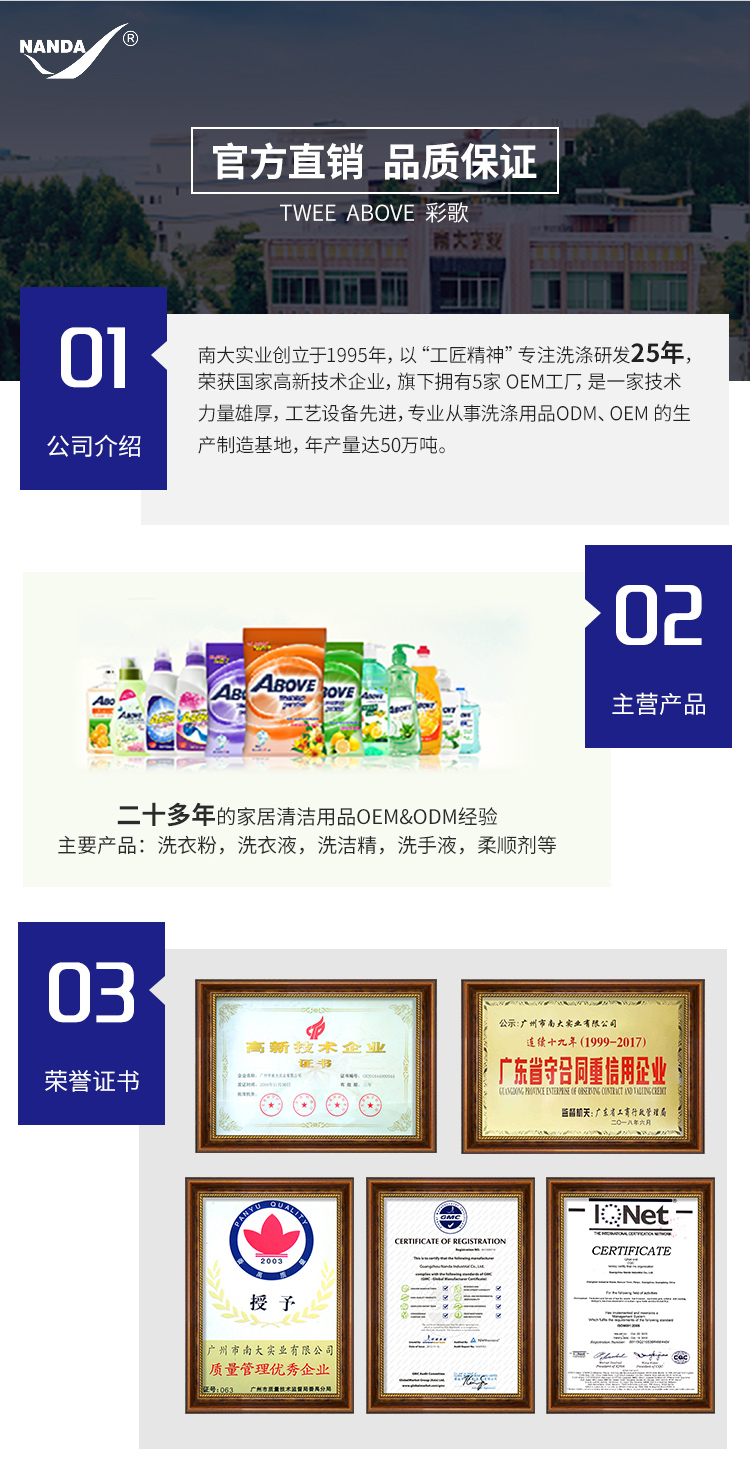 廣東南大集團(tuán)股份有限公司創(chuàng)立于1995年,以日化制 造為主,有著三十年以上行業(yè)服務(wù)經(jīng)驗(yàn)和口碑。榮獲國(guó)家高新技術(shù)企業(yè)、廣州市科技創(chuàng)新小巨 人企業(yè)等稱號(hào)。是一家技術(shù)力量雄厚,工藝設(shè)備先進(jìn), 專門從事洗滌用品ODM、OEM的生產(chǎn)制造基地,生產(chǎn)經(jīng)營(yíng) 產(chǎn)品有衣物洗滌類、衣物護(hù)理類、洗潔精類、家居清潔 類等 。