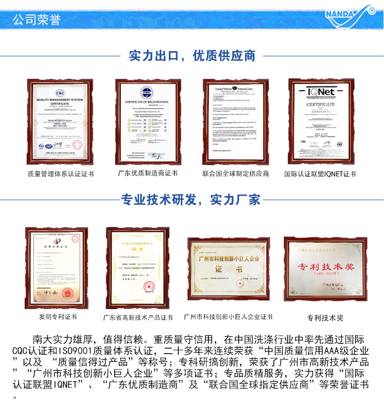 廣東南大集團(tuán)股份有限公司創(chuàng)立于1995年,以日化制 造為主,有著三十年以上行業(yè)服務(wù)經(jīng)驗(yàn)和口碑。榮獲國家高新技術(shù)企業(yè)、廣州市科技創(chuàng)新小巨 人企業(yè)等稱號(hào)。是一家技術(shù)力量雄厚,工藝設(shè)備先進(jìn), 專門從事洗滌用品ODM、OEM的生產(chǎn)制造基地,生產(chǎn)經(jīng)營 產(chǎn)品有衣物洗滌類、衣物護(hù)理類、洗潔精類、家居清潔 類等 。
